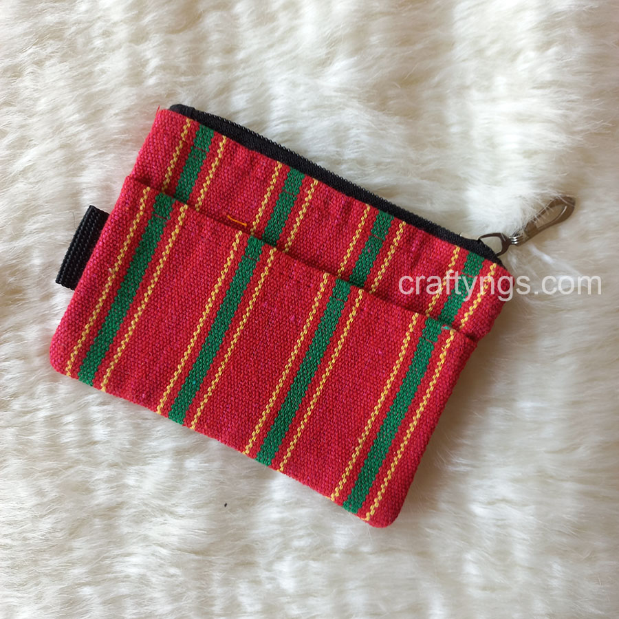 Hand-woven cotton coin purse. There is a zip to close the main part. With a small pocket on the outside.