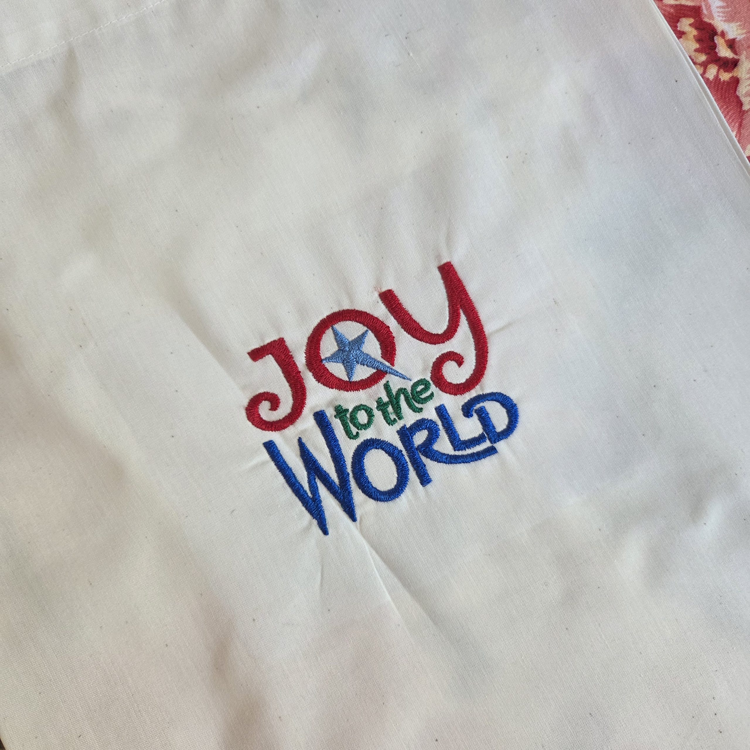 The center features a delicate, high-quality embroidered “Joy to the World” design, making it a perfect festive accessory or thoughtful holiday gift.