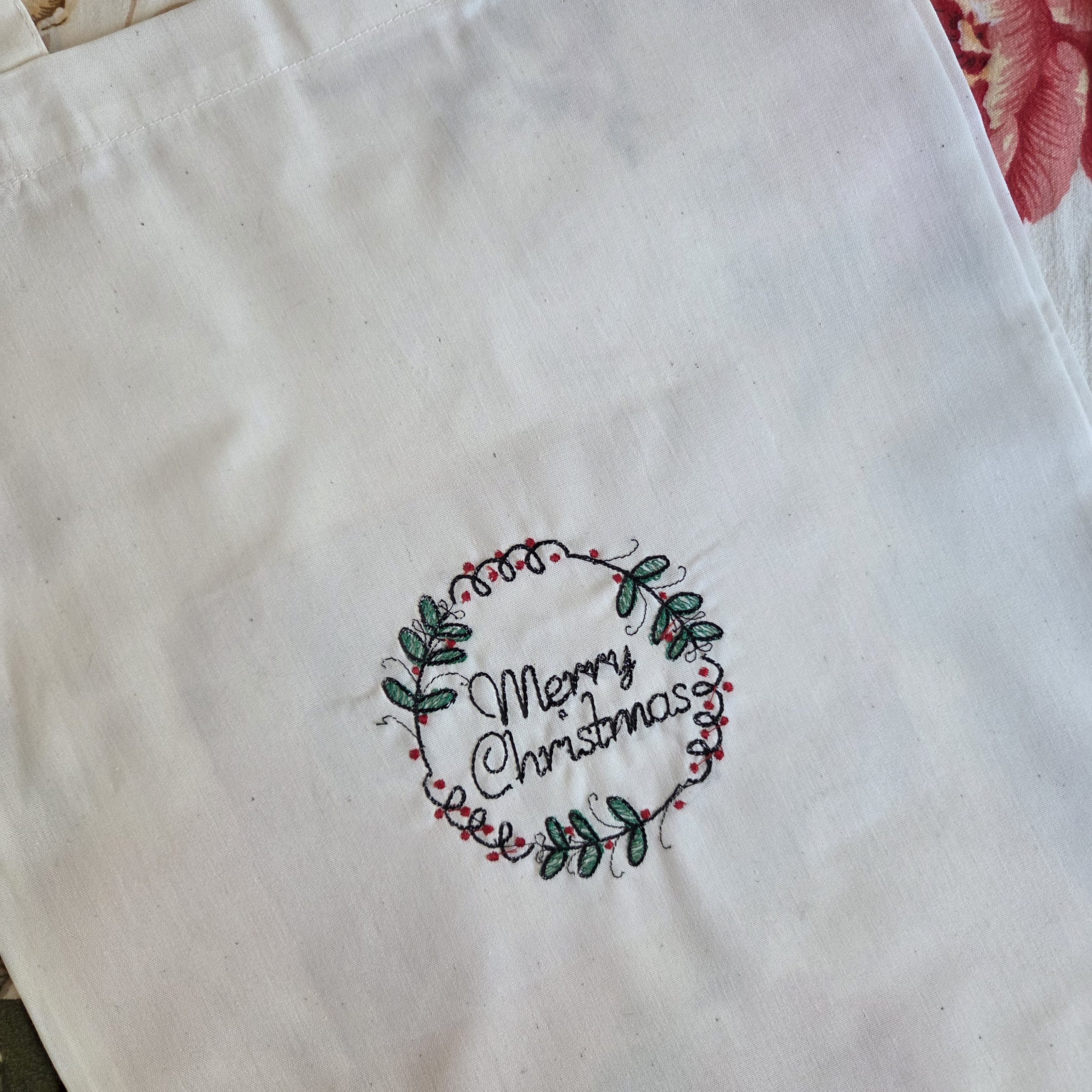 Add a festive touch to your everyday errands with this beautiful embroidered Christmas tote bag. Featuring a delicate wreath design with “Merry Christmas” stitched in the center, this bag is perfect for holiday shopping, gifting, or carrying your essentials in seasonal style.